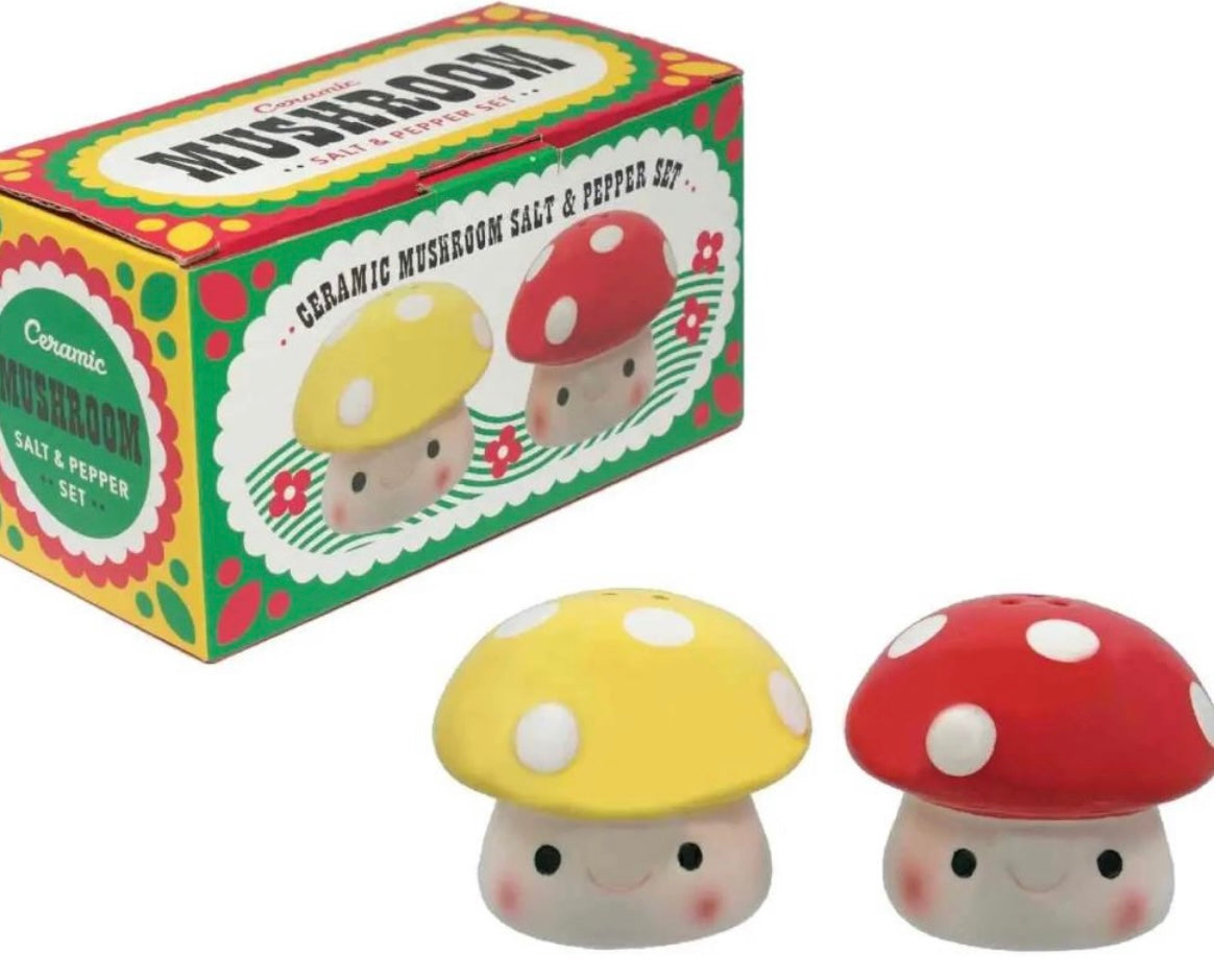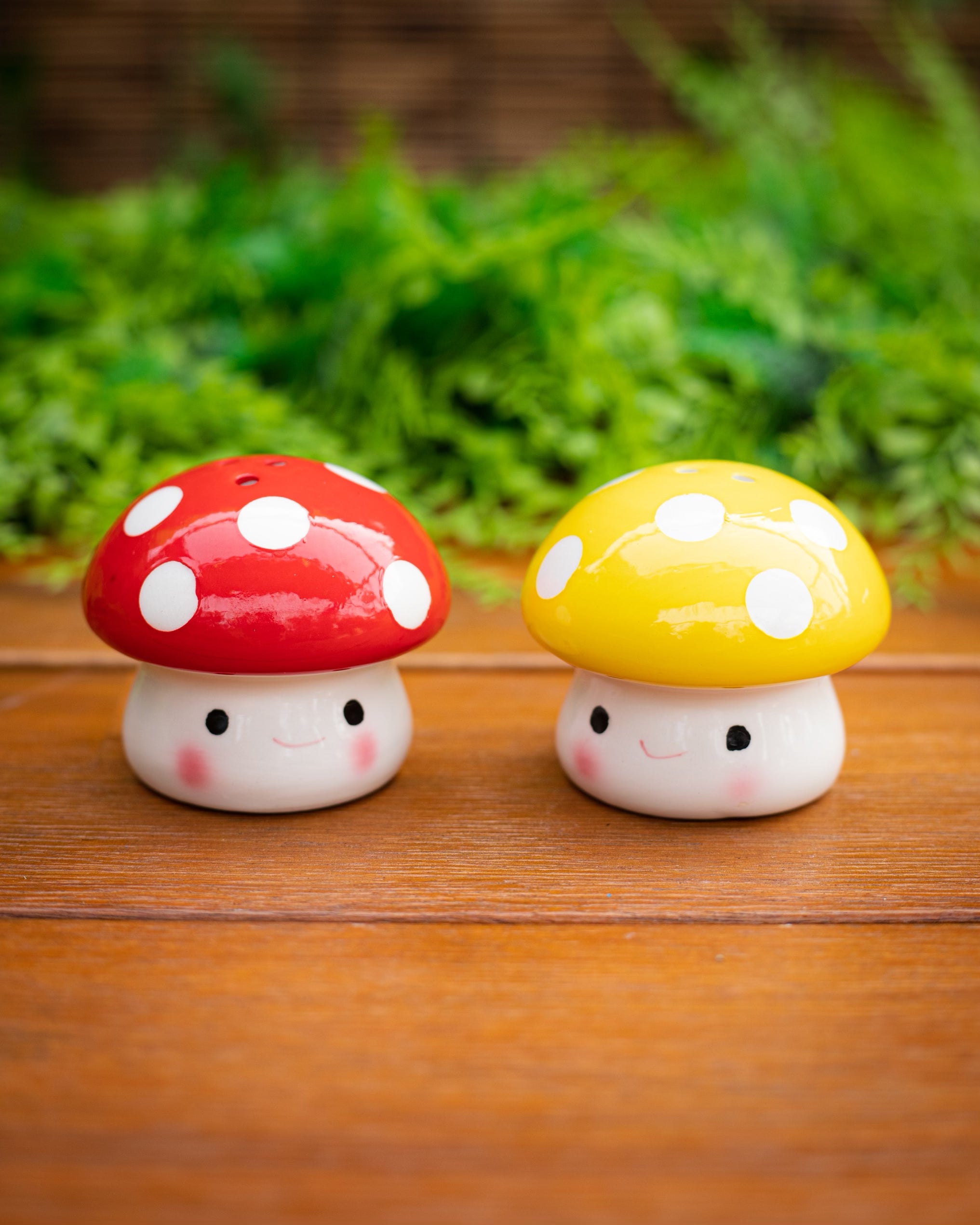 - Charming salt and pepper shaker set featuring red and yellow mushrooms with white polka dots