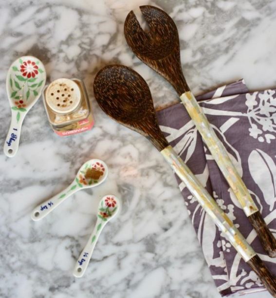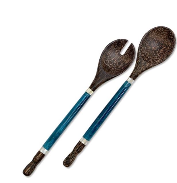 These Capiz Shell Salad Servers make a terrific wedding gift, or hostess gift. Carved from beautiful palm wood and inlaid with capiz shells. They are made of palm wood from old trees that have been retired from palm oil groves. After a certain age the trees can no longer be used for food production and must be thinned so new trees can be planted. Made in village workshops in Bali and Java.