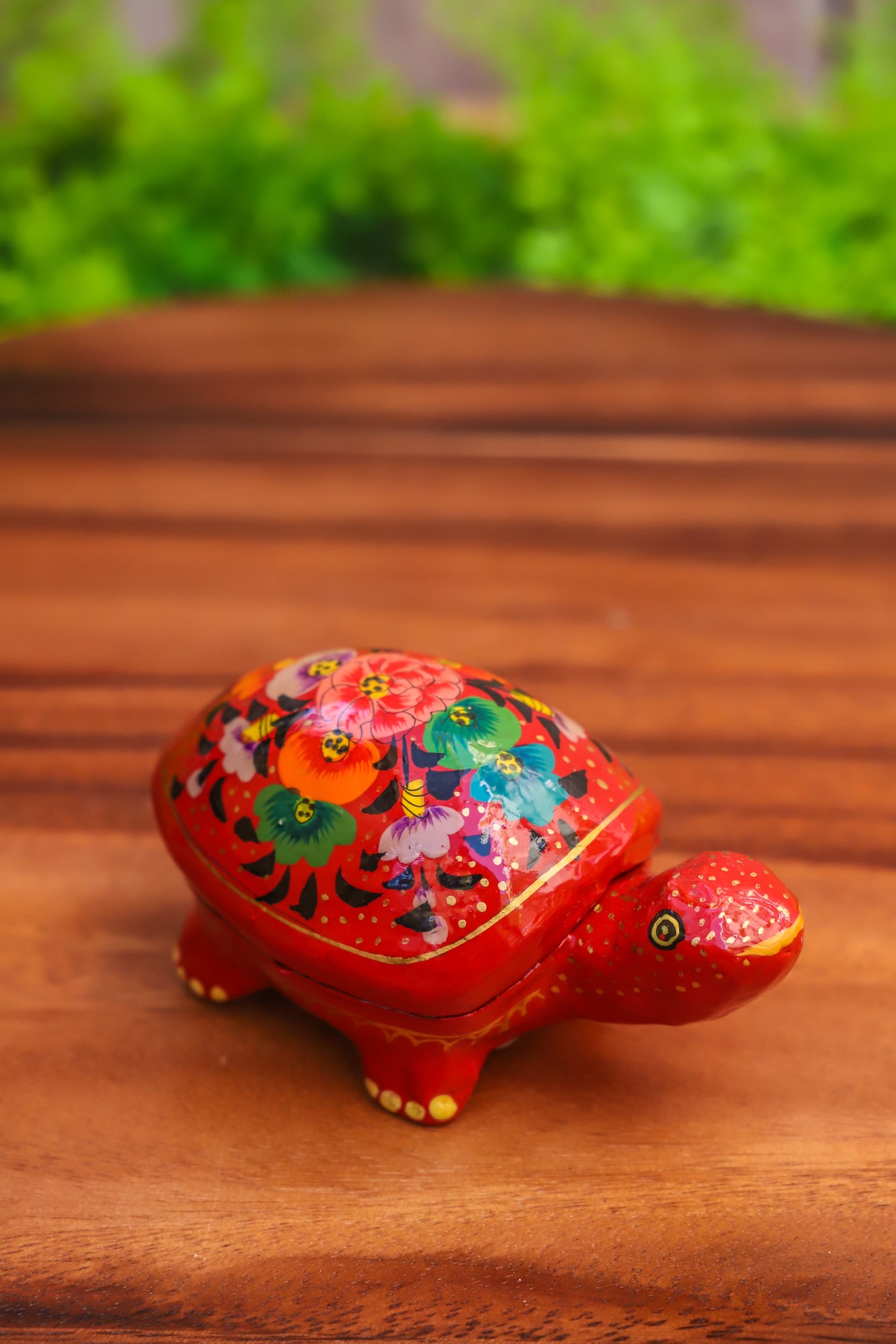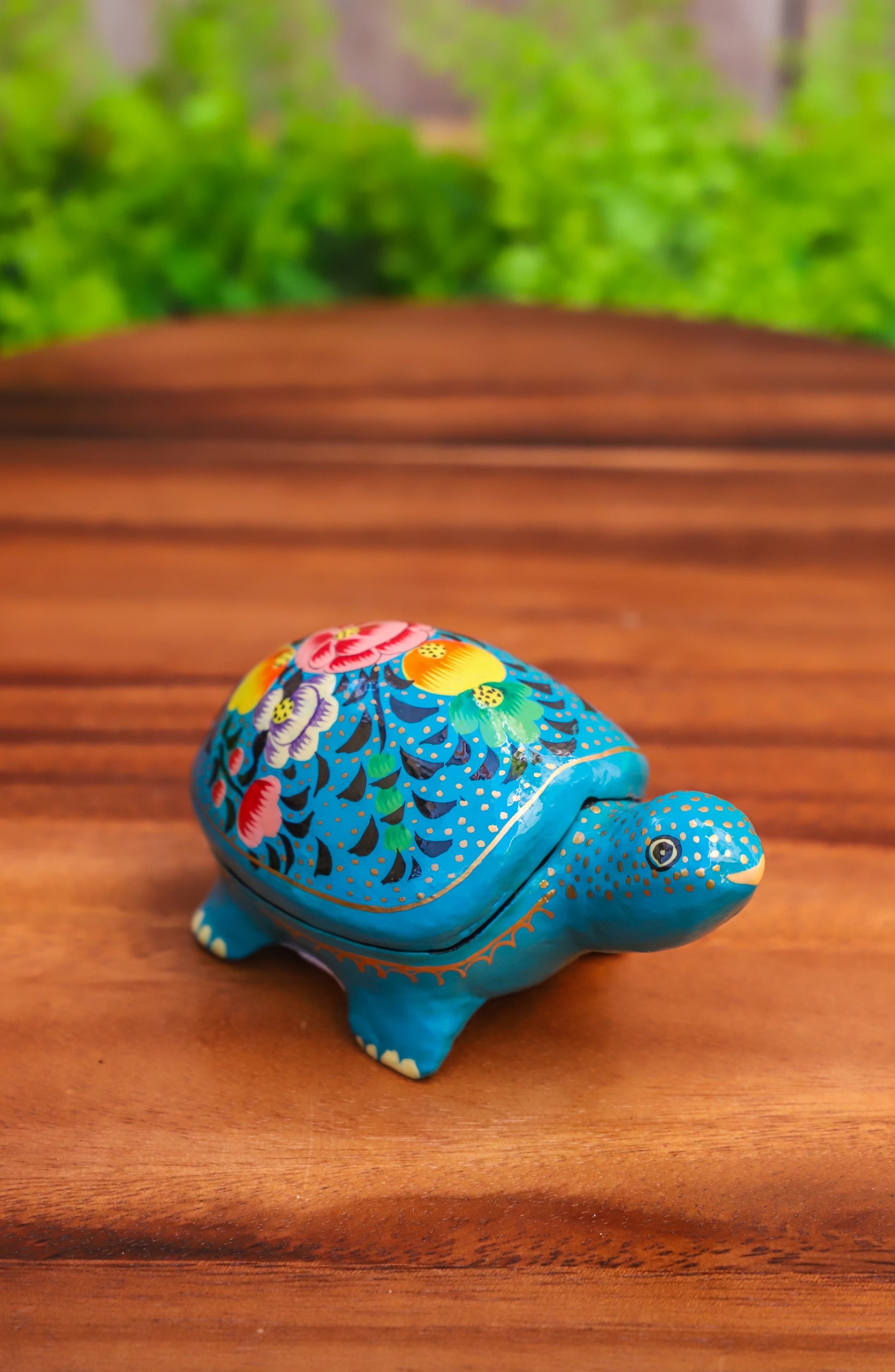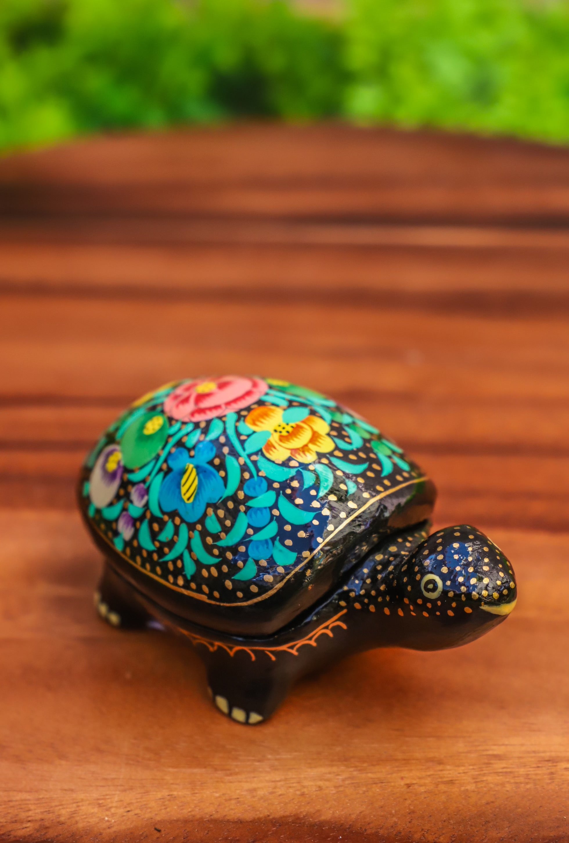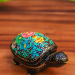 assorted turtle boxes in vibrant, hand-painted floral designs with gold accents. Turtle shell lifts to reveal storage space.