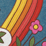 A decorative cotton pillow from our Wood Burning Collection displaying a vibrant rainbow and flower design replicated from original wood burned art on stonewashed blue background.