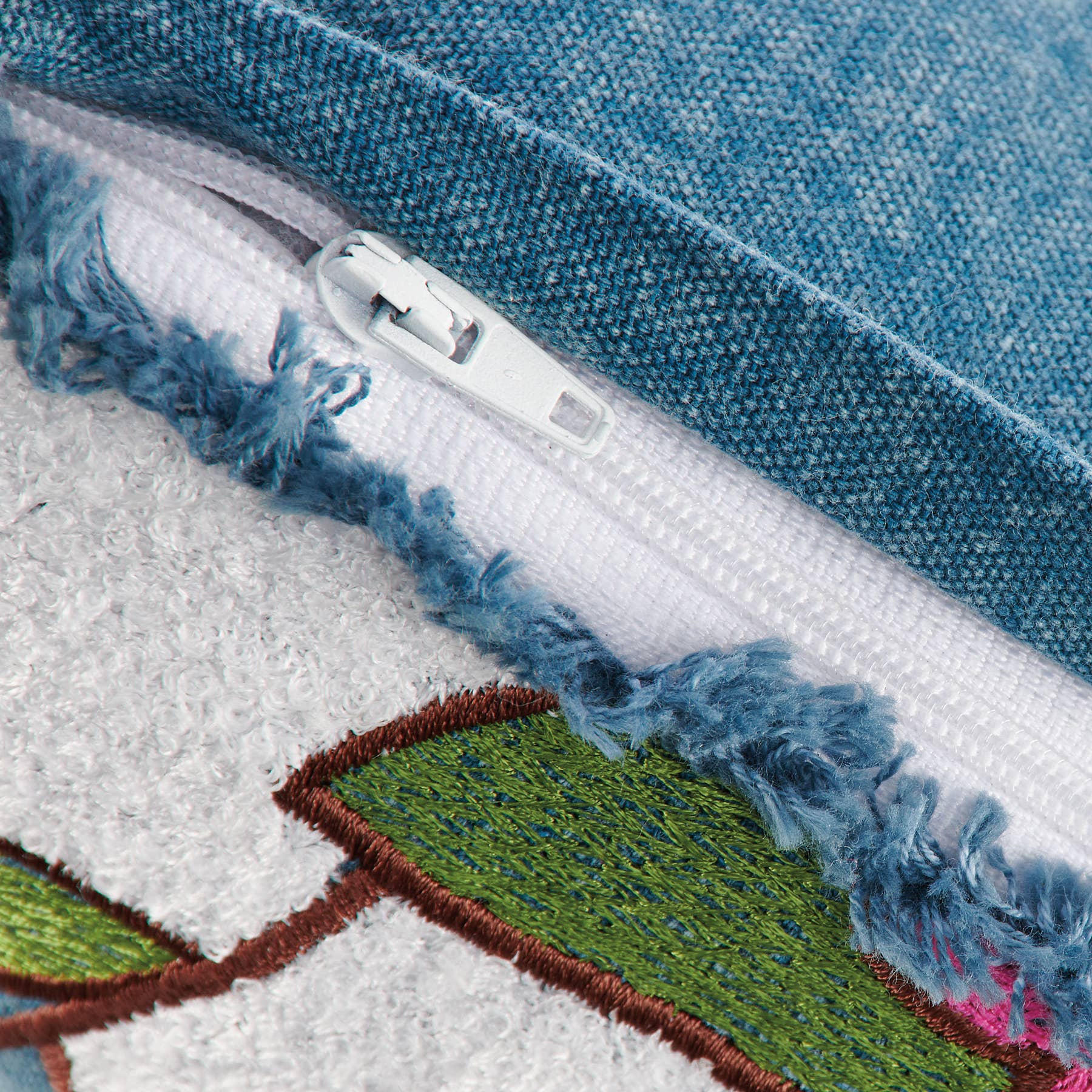 Design includes embroidered and tufted chenille details for added texture.