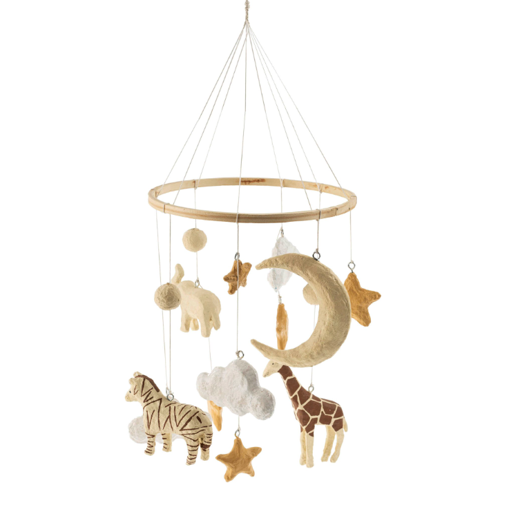 Indulge in sweet dreams with the Safari Cotton Mache Mobile. As if on the savannah, zebras, giraffes, elephants, stars and clouds float above the crib creating a soothing atmosphere to lull your little one into a peaceful slumber. This mobile serves as charming decor for both stylish nurseries and boho-inspired baby rooms.