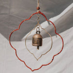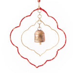 Upcycled metal hanging bell chime features a handcrafted copper bell in a cascading Ashram window inspired arches loop setting with colorful sari wrap accents and sturdy jute hanging loop. Due to the upcycled nature of the sari material used in this product, expect variation in colors and patterns.