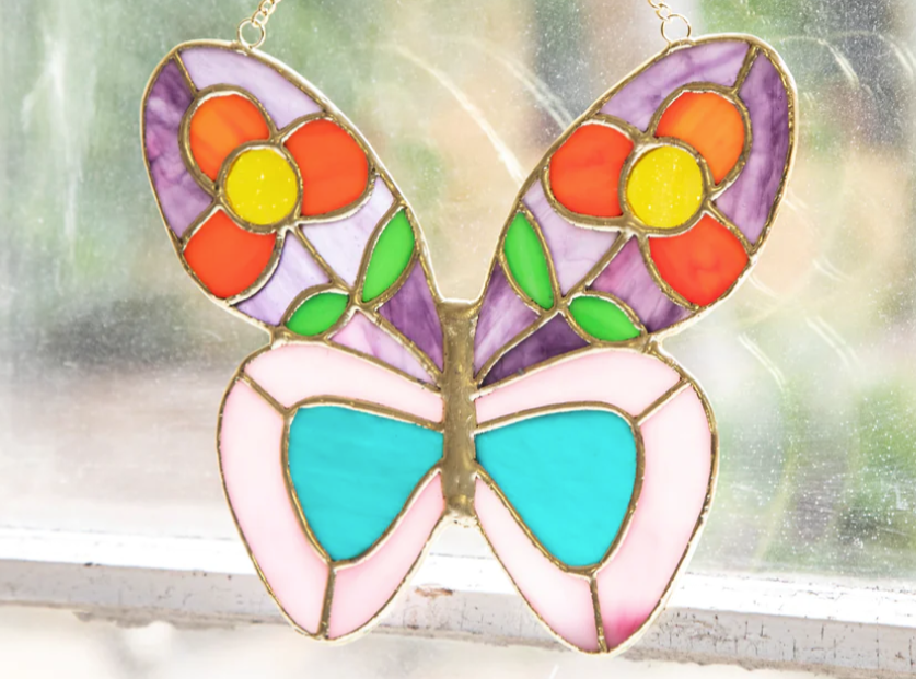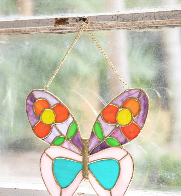 Do you have a place in your home that needs a splash of bright and cheery colors? Pop up this Stained Glass Hanging in a window and be mesmerized as the vivid colors come to life! This fanciful folk flower design shines in the sun and will brighten and uplift any room in your home. It’s also a winsome wall hanging above a desk or on any art wall – even when a window isn’t convenient. Let the treasures in your home remind you to live happy!