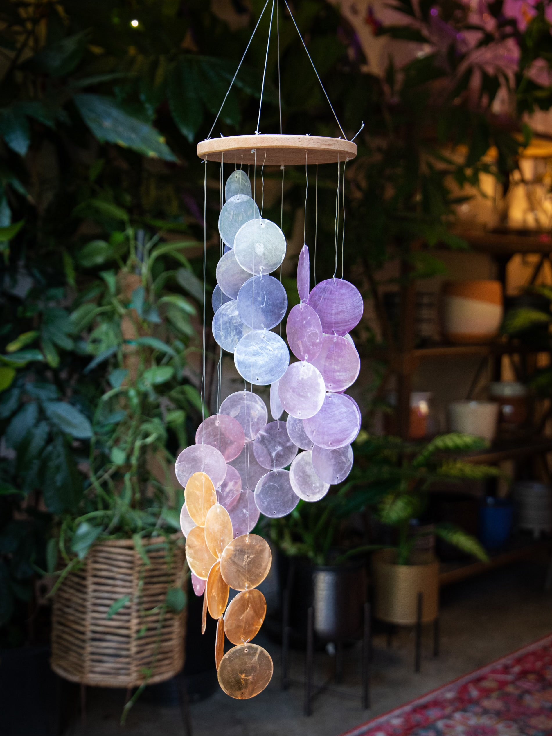 - These wind chimes are 28" long and perfect length with many capiz shells to catch the light and give a stunning display and sound in your living space, garden, patio, or porch.