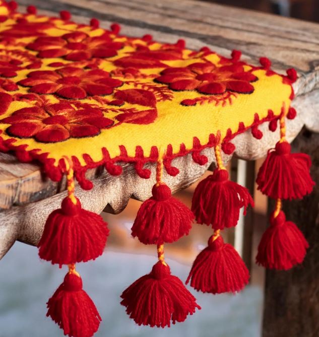 This magnificent table runner is created by Peru's Edwin Choquecahua. Woven on a pedal loom, the yellow alpaca-blend runner is lavishly embellished with floral embroidery in red and orange. Red pompoms and tassels at both ends complete the design.