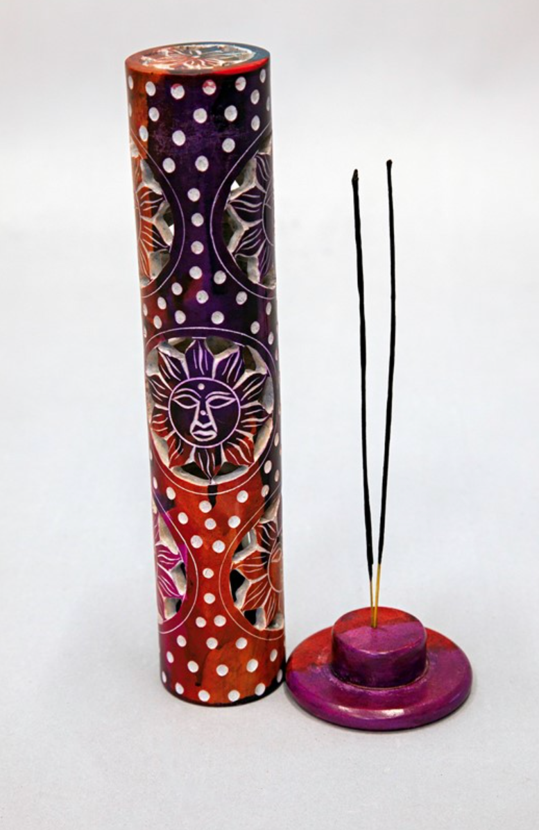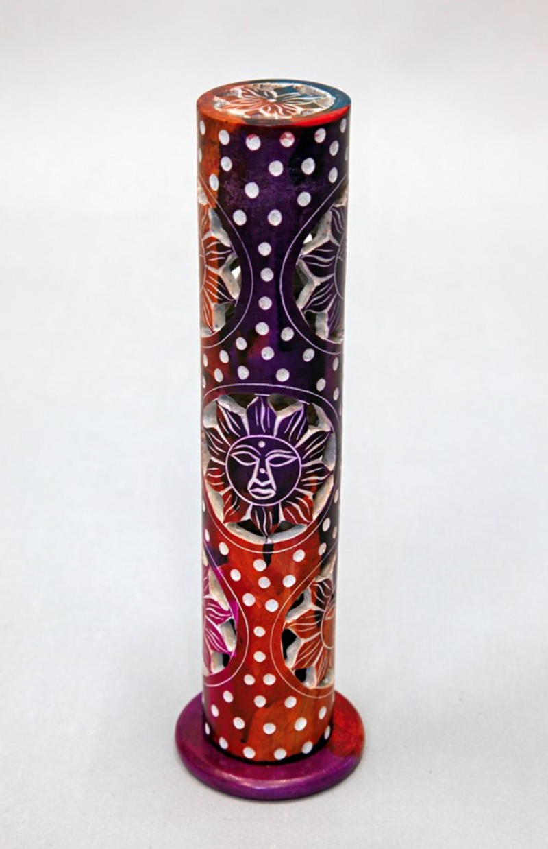 - An intricately hand carved round shape incense holder made up of soapstone with multiple holes for holding incense sticks.