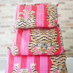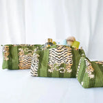 These toiletry bags are a perfect trio for your travel routine and organization. Featuring a hand-printed tiger pattern set against pink and red stripes and quilted stitching, these adorable bags are eye-catching and perfect for any on-the-go lifestyle. Grab one or purchase the whole trio of different sizes and travel in style. These bags are made by a woman-owned store that I order them from.