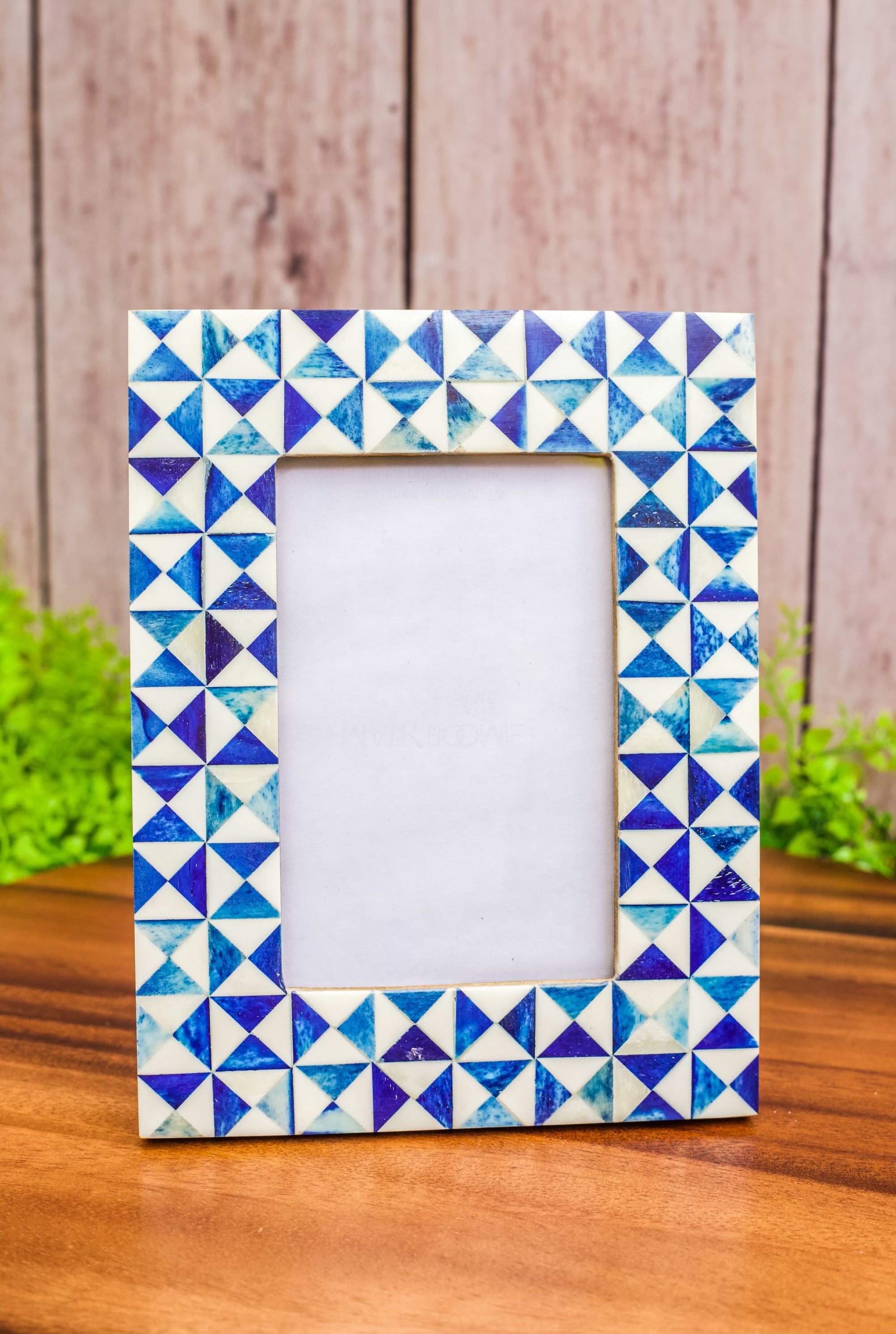 Our Varuna Collection incorporates traditional Indian art forms in modern, sea-inspired designs handcrafted from ethically sourced bone tile. Master artisans in Old Delhi skillfully hand carve bone elements to create unique, eye-catching mosaic designs. This handcrafted frame is thoughtfully designed for stylish display, featuring a geometric wave motif mosaic combining hand carved bone tiles in pearly white and cobalt blue. Iron latches for frame closure and sturdy leg on the back to keep upright.
