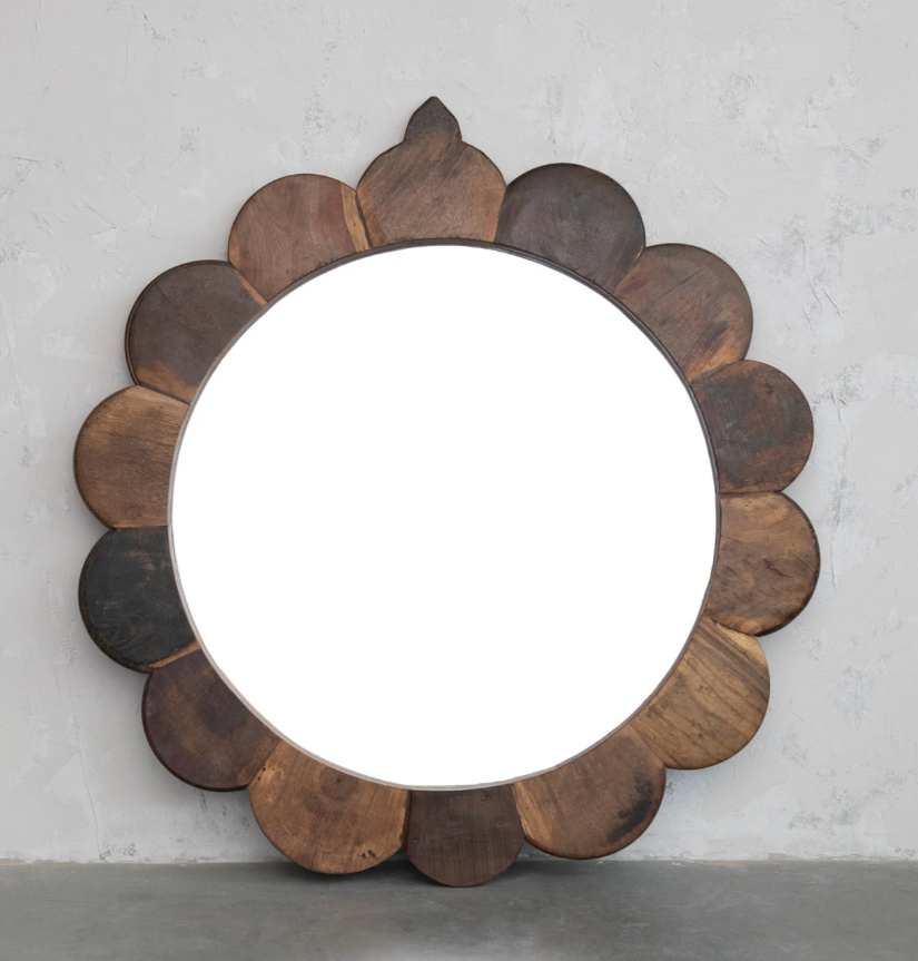 Mirrors are more than just functional objects; they can also enhance the style and beauty of any home or office space. Mirrors can create the illusion of space, reflect light, and add drama to any wall. Whether looking for a round, oval, square, or rectangular mirror, there is a shape to suit any preference and occasion. Whether looking for a metal, wood, glass, or ceramic frame, there is a material to match any design and mood. Whether looking for a floor, wall, or table mirror, there is a size to fit any space. Check them today and find the best mirrors for any space. This Wall Mirror is a stunning rustic mirror with a natural finish and a unique scalloped design, featuring a 35-inch round mirror at its center. This mirror is best suited for farmhouse-style home décor, adding a touch of warmth and character to any entryways, living rooms, or bedrooms. Its integrated hanging mechanism allows easy wall mounting in horizontal and vertical orientations, giving it a vintage and reclaimed look with distinct variations making it a truly one-of-a-kind addition to any space. Made of reclaimed wood and glass.