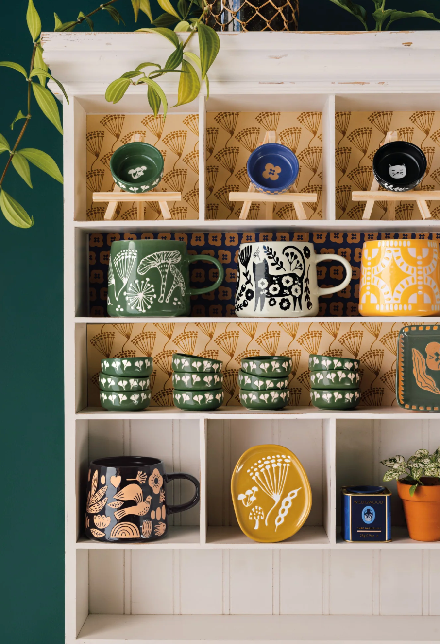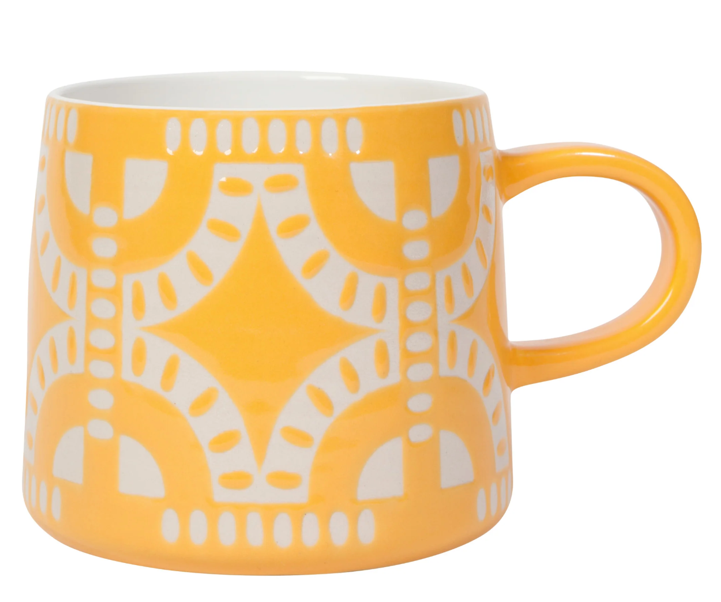 Shapes shift and spin with the Pilipala imprint mug. A special wax-resist technique makes each mug unique, while the ribbed texture and satin matte glaze further the tactile quality.The perpetual appeal of quilt-inspired patterns blend seamlessly with a contemporary palette in this design from Danica Studio.