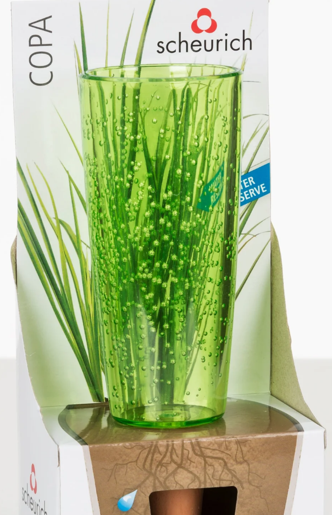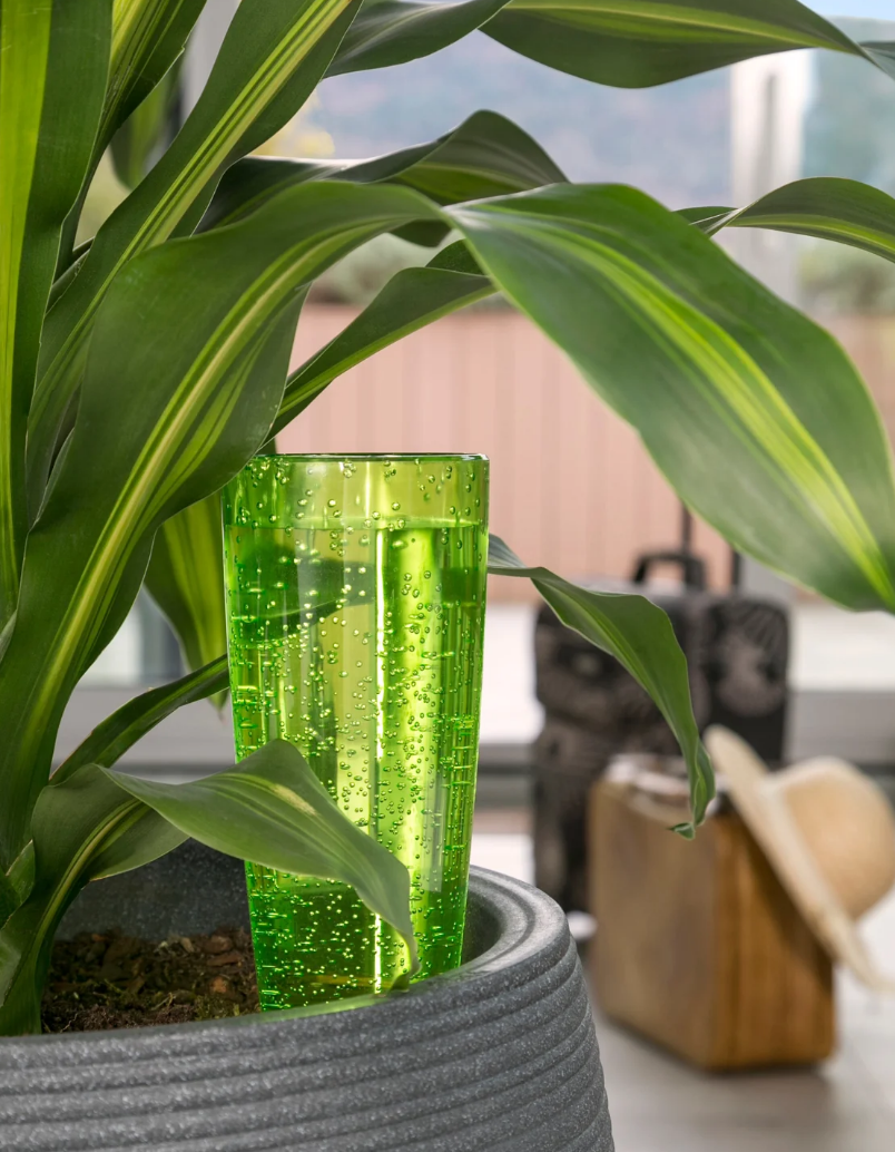 Copa is an elegant watering device crafted from UV-resistant translucent plastic. Serving as a water reservoir, it waters plants in the garden, on terraces and balconies, as well as indoor areas. Simply fill with water, and it gradually dispenses moisture through its clay tip. The plant absorbs only the water it requires. It ensures your plants are watered even when you're away. It has a capacity of 5oz and measures 2.5" in width, 2.5" in depth, and 7.5" in height, weighing 0.5lb.