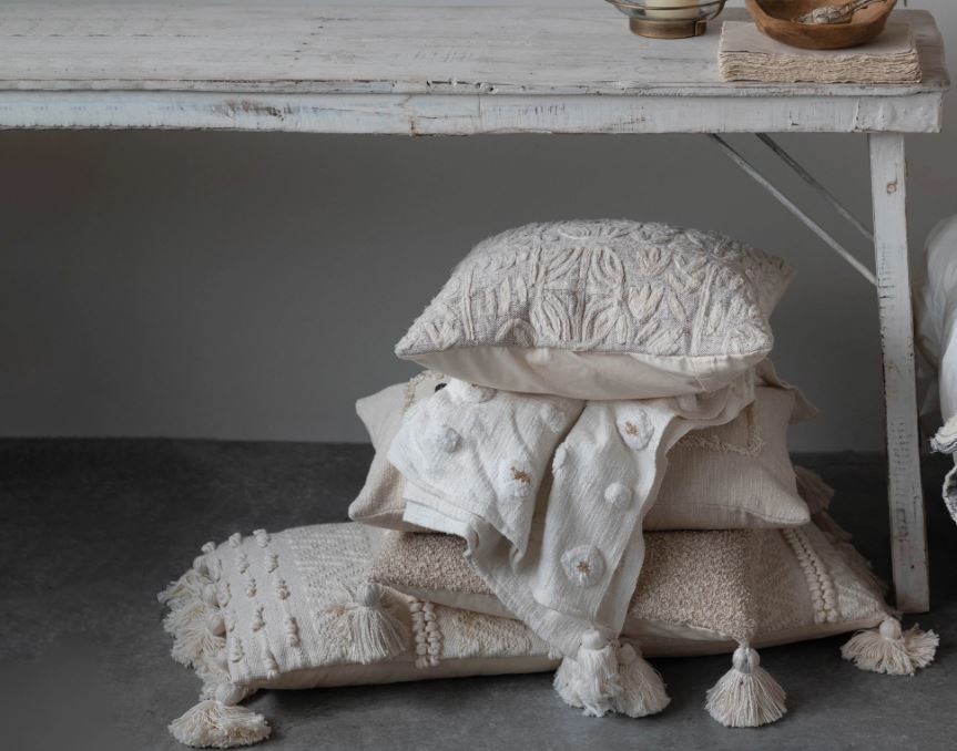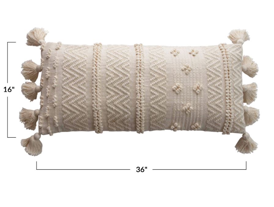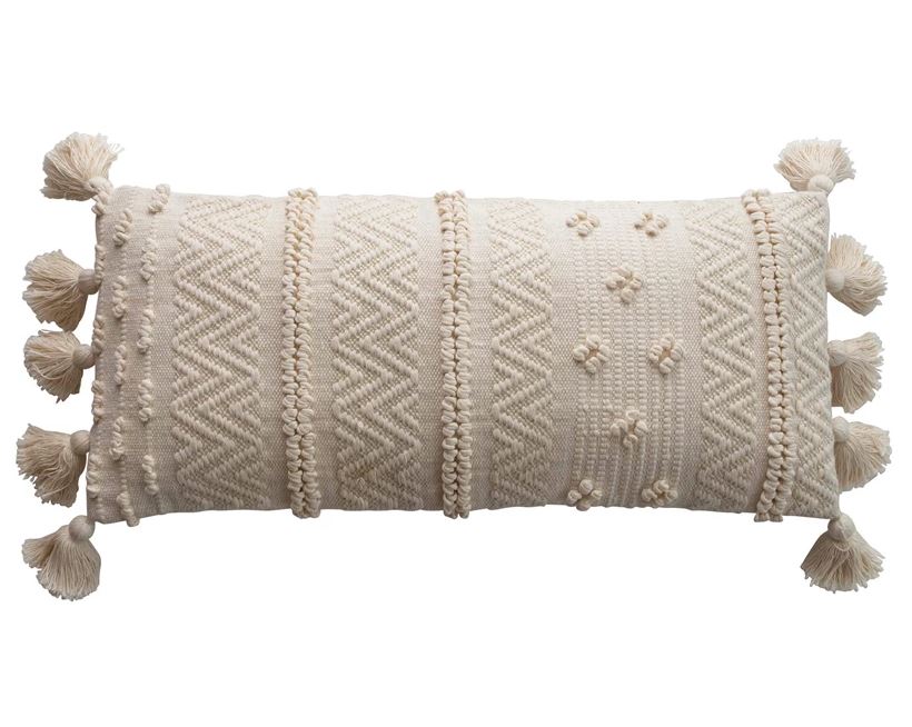 This simple, neutral cotton embroidered pillow instantly upgrades any couch or chair, and catches the eye effortlessly with its cream color and pom poms. Made out of cotton and lumbar, this pillow brings both comfort and style to any seating.